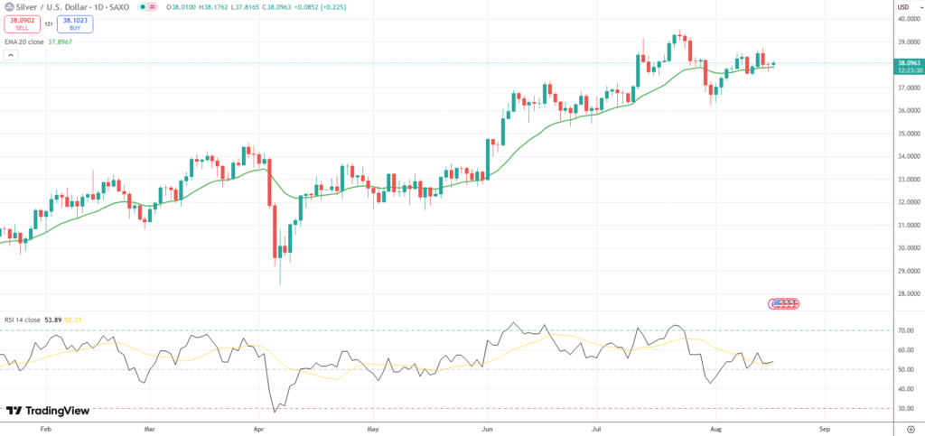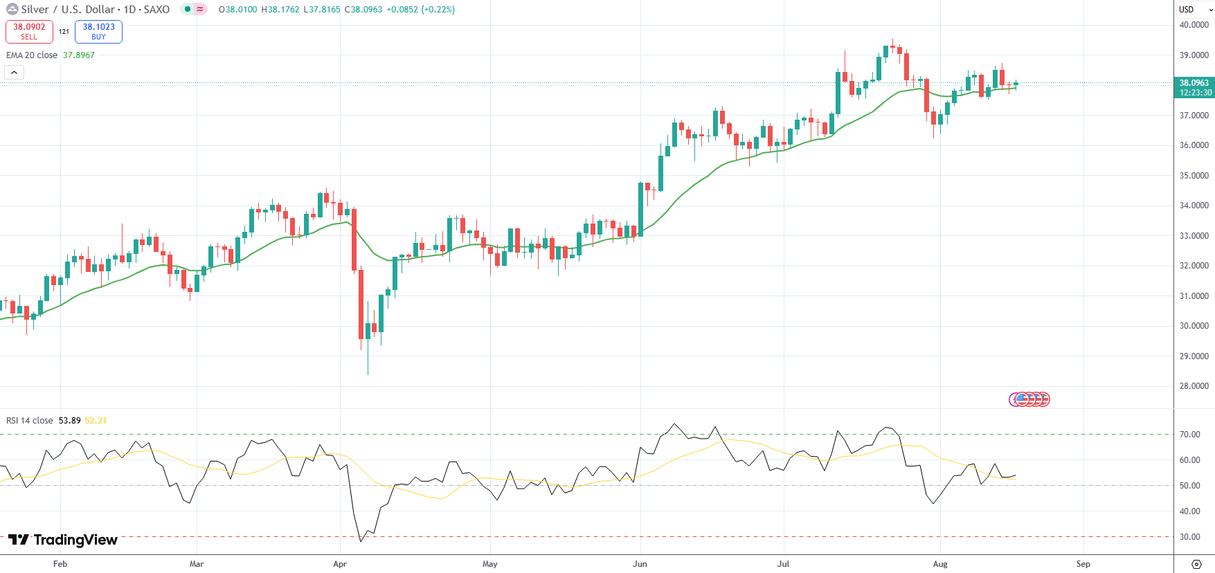 Silver was last up 0.22% on the day to trade at $38.09 per troy ounce.
