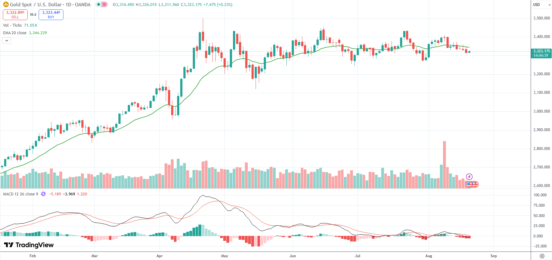 Spot Gold was last up 0.23% on the day to trade at $3,323.17 per troy ounce.