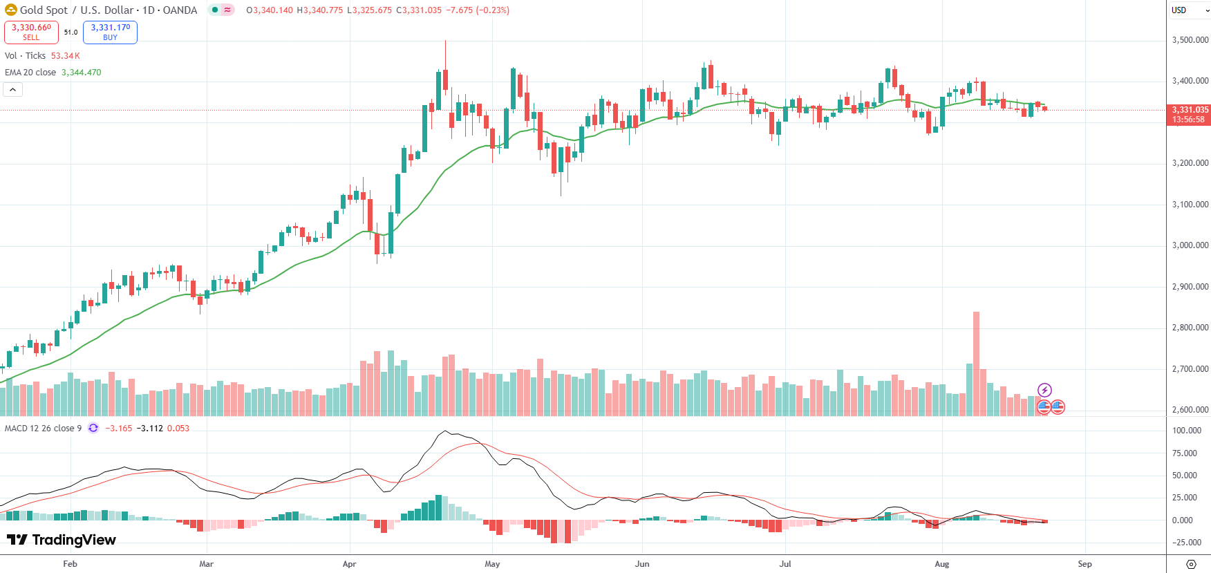 Spot Gold was last down 0.23% on the day to trade at $3,331.03 per troy ounce.