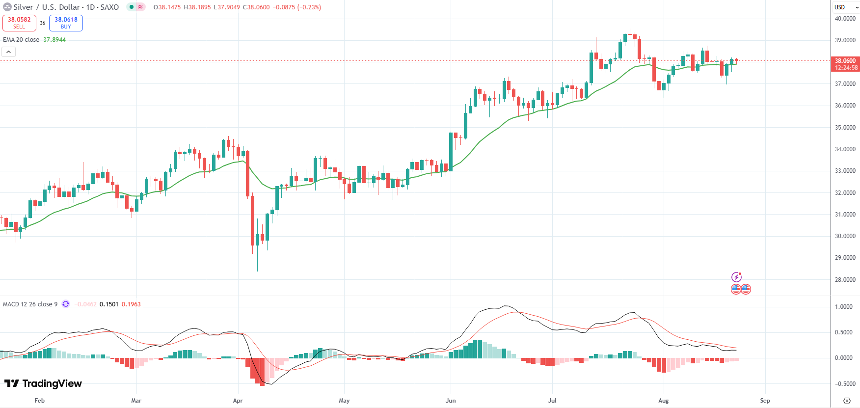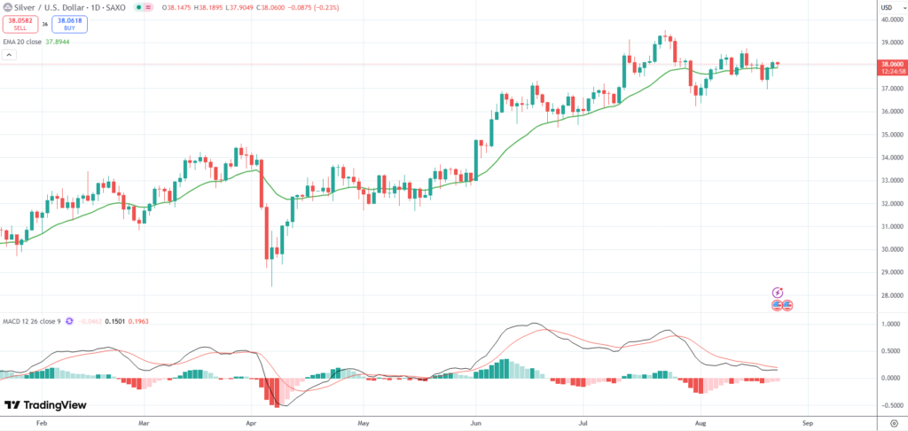 Spot Silver held near the $38 mark on Friday, weighed down by a stronger US Dollar, while market players focused on Fed Chair Jerome Powell’s speech at the annual symposium in Jackson Hole, Wyoming, for cues on policy outlook.