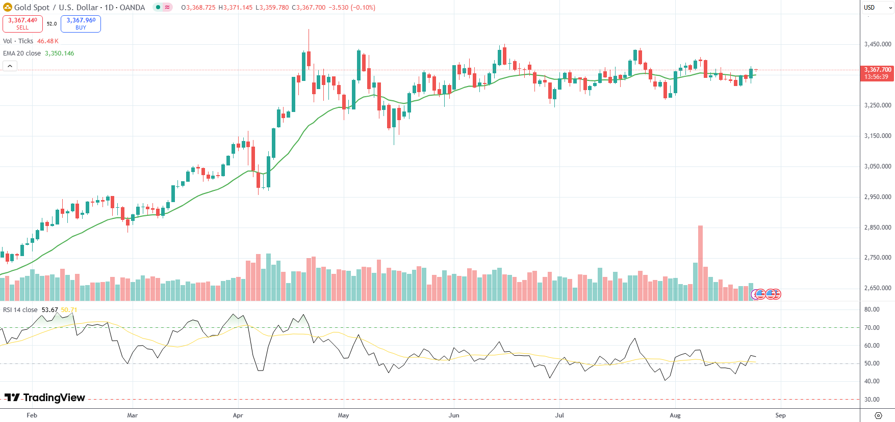 Spot Gold was last down 0.10% on the day to trade at $3,367.70 per troy ounce.