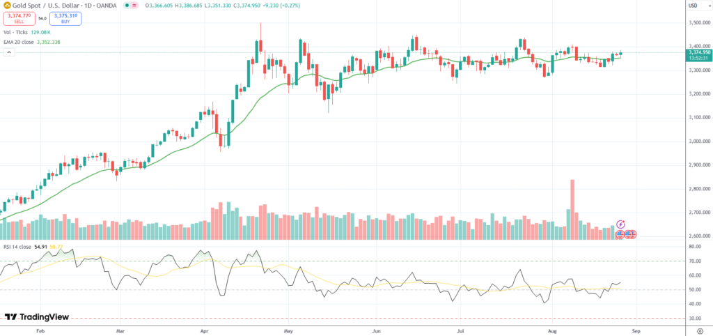 Spot Gold scaled a fresh 2-week peak of $3,386.68 on Tuesday amid heightened political uncertainty after US President Donald Trump dismissed Federal Reserve Governor Lisa Cook.