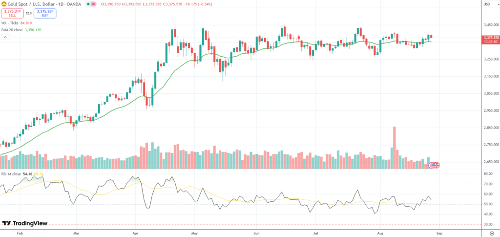 Spot Gold held not far from a 2-week peak of $3,393.74 on Wednesday on renewed concerns over the Federal Reserve’s independence.