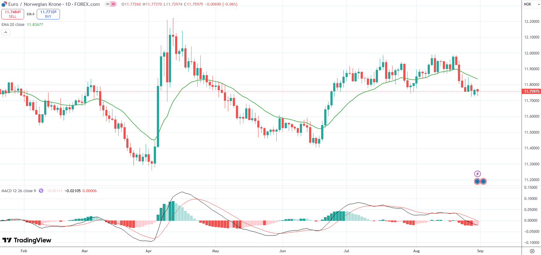 The EUR/NOK currency pair settled above recent low of 11.7235, its weakest level since June 24th, as market players digested the latest inflation data prints out of Euro Area’s largest economies.