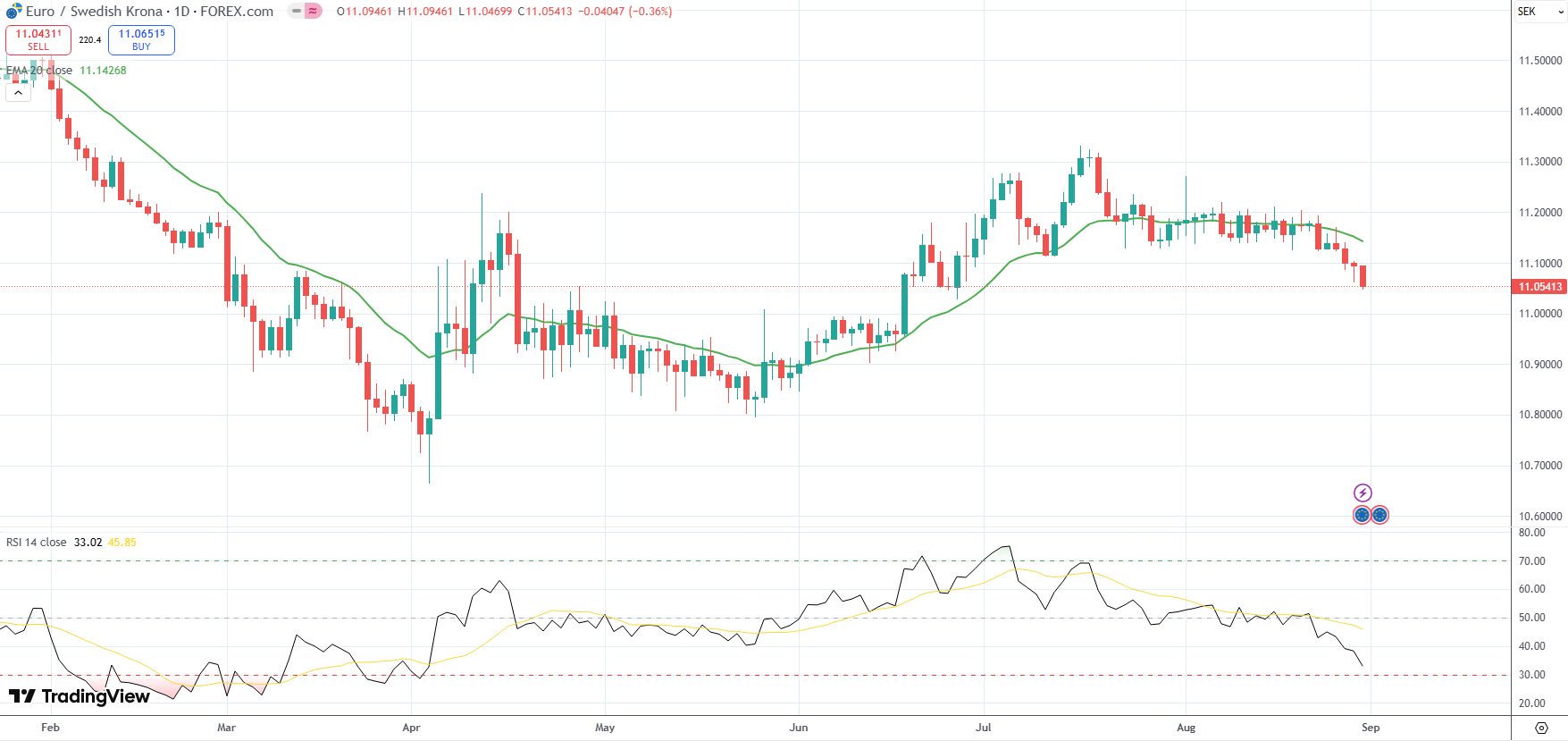 The EUR/SEK currency pair settled above Friday’s low of 11.0470, its weakest level since June 26th, as market players digested the latest inflation data prints out of Euro Area’s largest economies and Swedish GDP numbers.