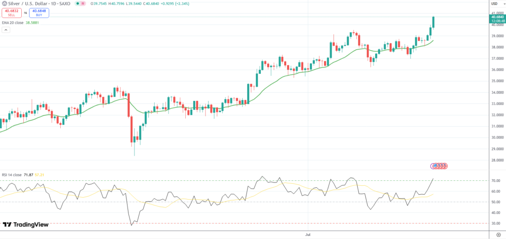 Spot Silver scaled a new 14-year peak of $40.76 on Monday, supported by increased investor expectations of an interest rate cut by the Federal Reserve this month.