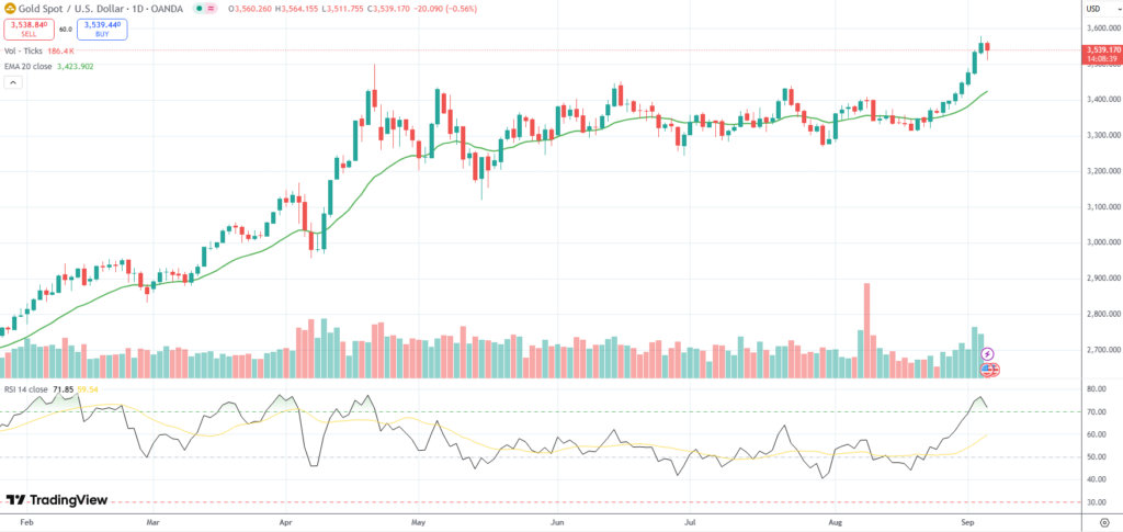Spot Gold pulled back from an all-time high of $3,578.50/oz. on Thursday on likely profit taking after recent rally.