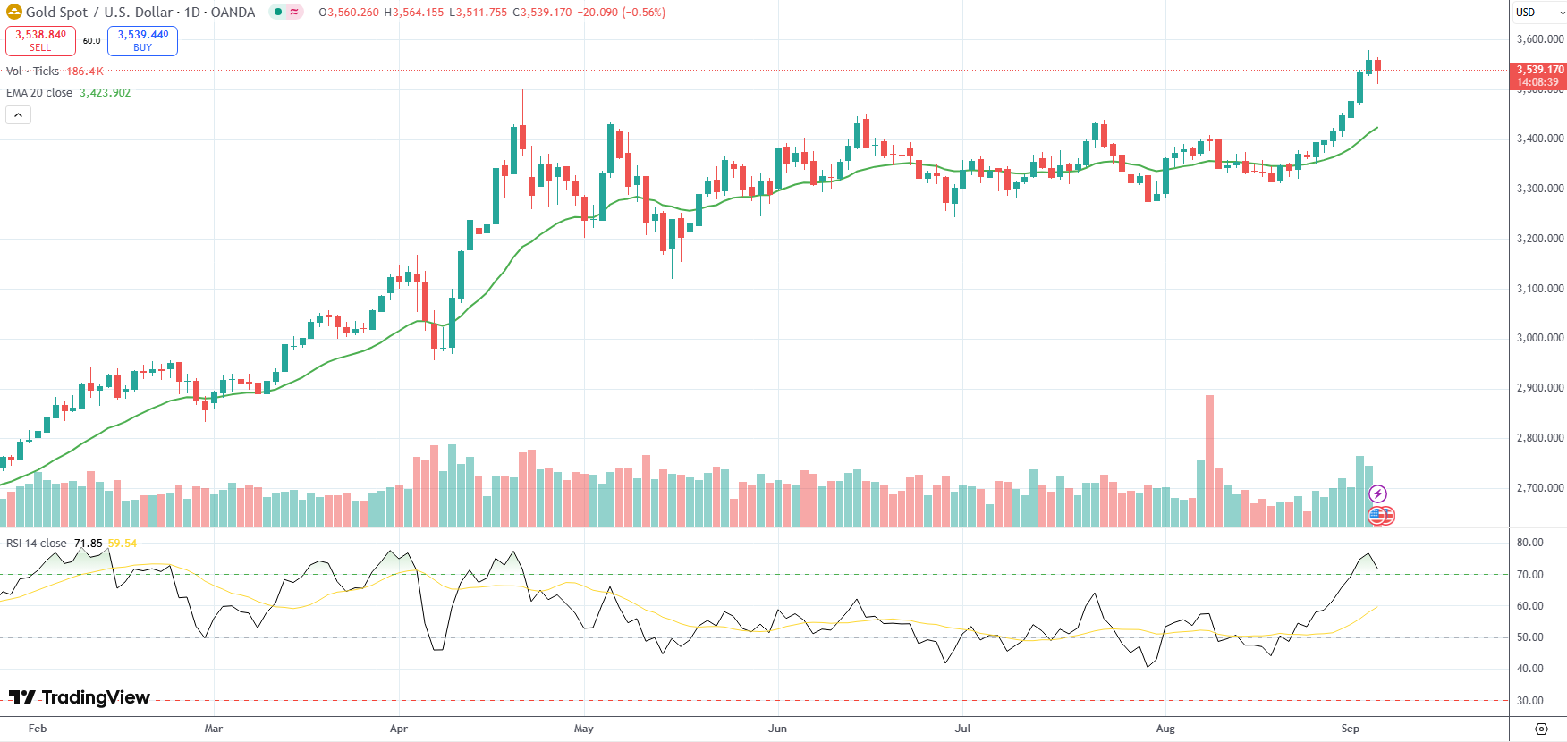 Spot Gold was last down 0.56% on the day to trade at $3,539.17 per troy ounce.