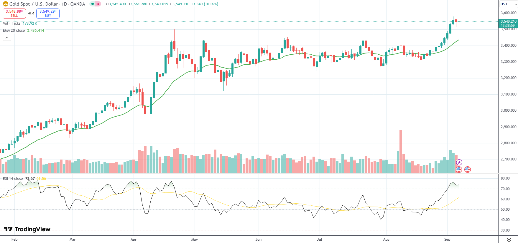 Spot Gold was last up 0.09% on the day to trade at $3,549.21 per troy ounce.
