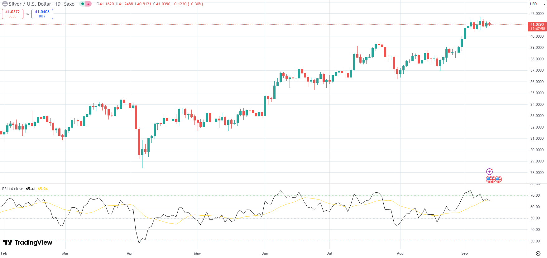Spot Silver eased but held close to a 14-year peak of $41.66/oz. on Thursday, supported by investor expectations of a Federal Reserve interest rate cut this month and ahead of the key US CPI inflation report.