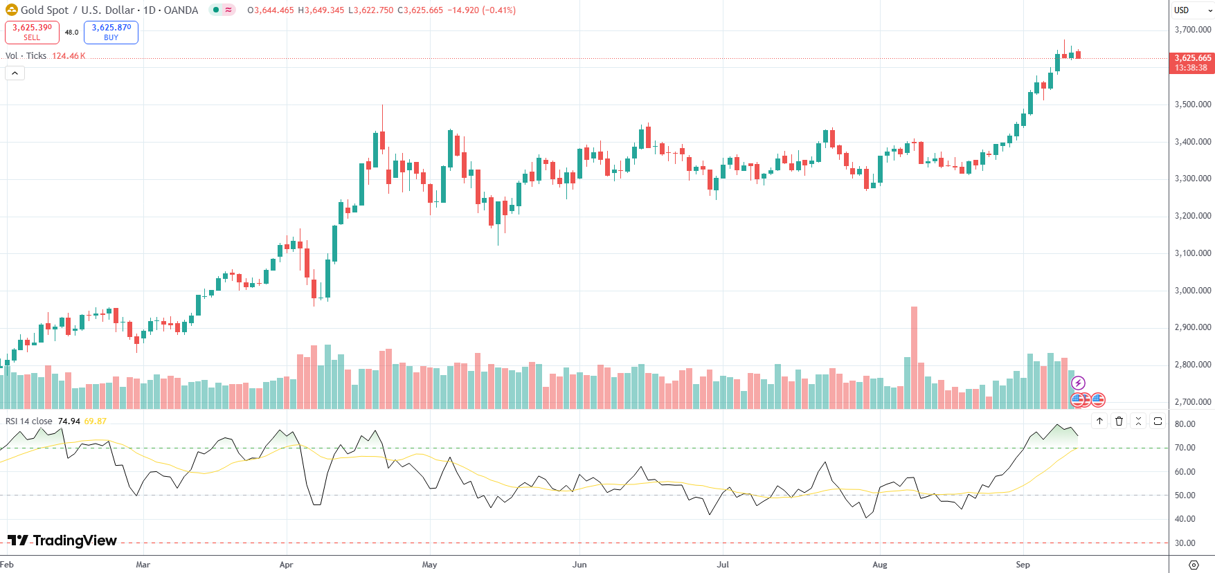 Spot Gold was last down 0.41% on the day to trade at $3,625.66 per troy ounce.