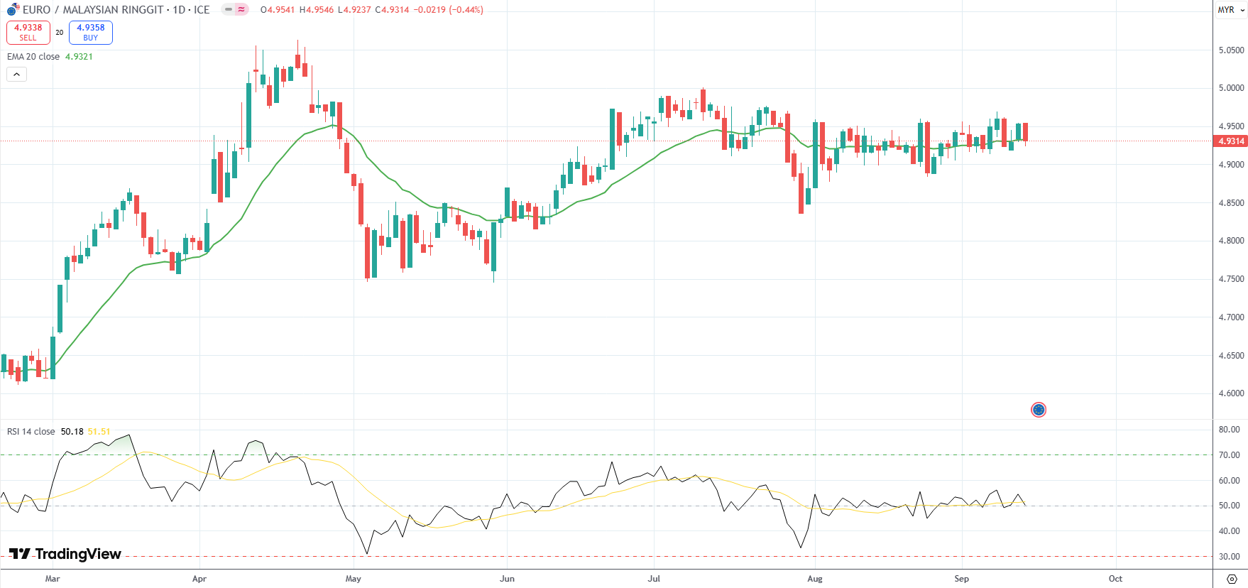 The EUR/MYR currency pair settled below recent high of 4.9692, its strongest level since July 28th, in the wake of the European Central Bank’s policy decision.