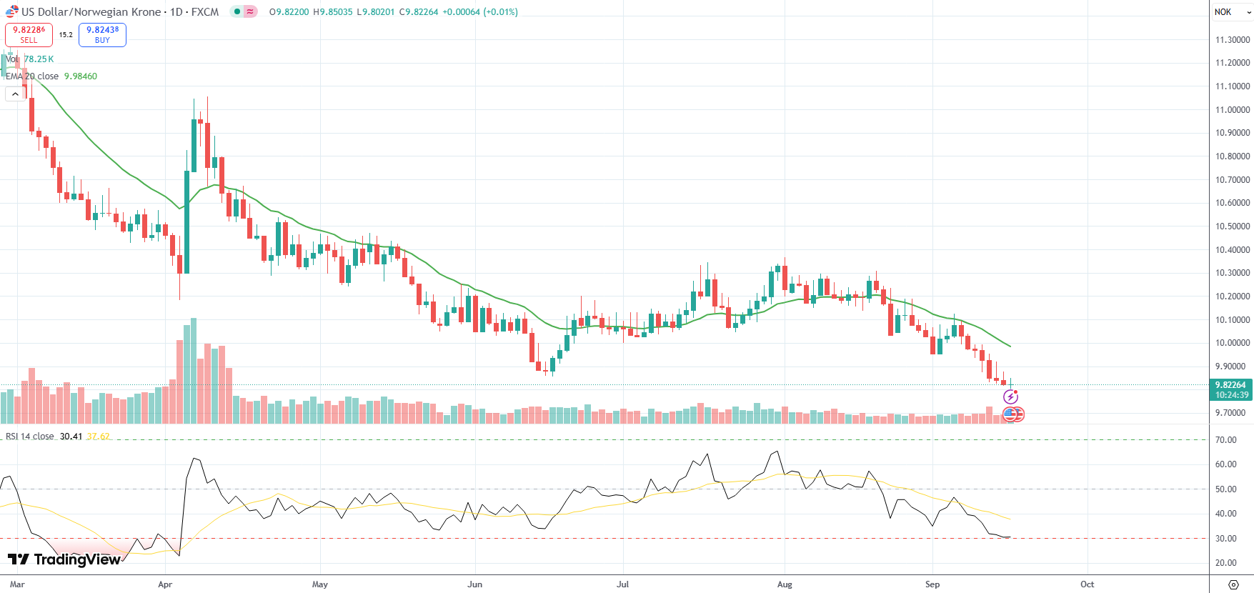 The USD/NOK currency pair was last up 0.01% on the day to trade at 9.8226.