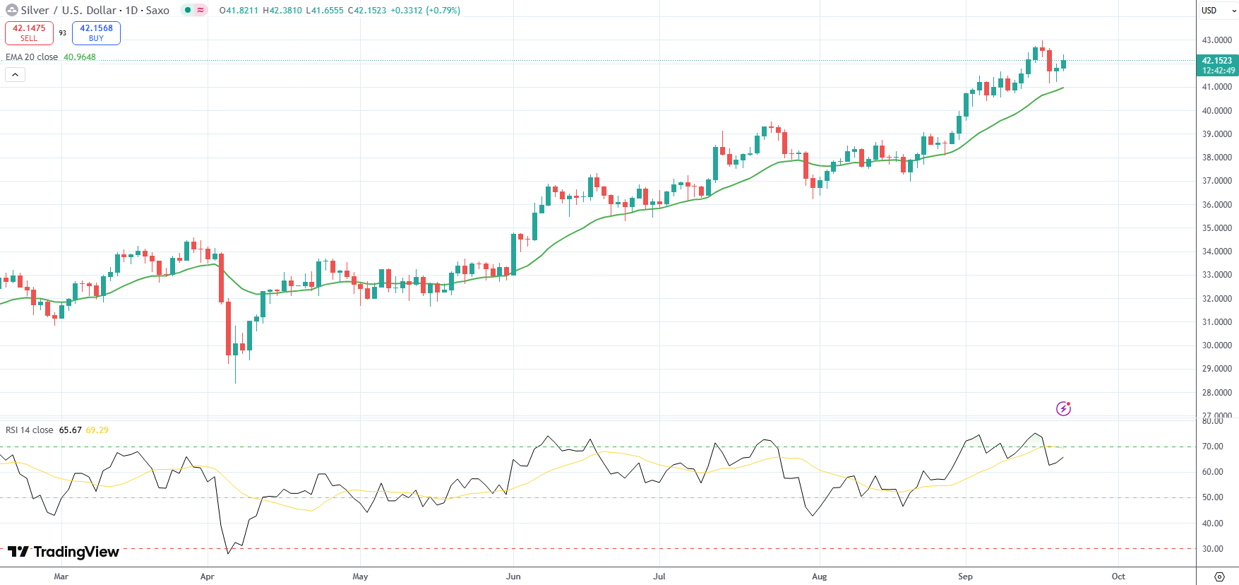 Spot Silver traded within striking distance of a 14-year peak of $42.97/oz. on Friday following a measured interest rate cut by the Federal Reserve and as the central bank signaled a gradual easing path by year-end.
