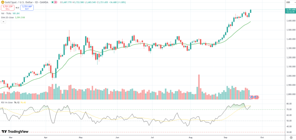 Spot Gold scaled a fresh all-time high of $3,722.41/oz. on Monday on expectations the Federal Reserve will continue easing its monetary policy even as the US economy remains resilient.