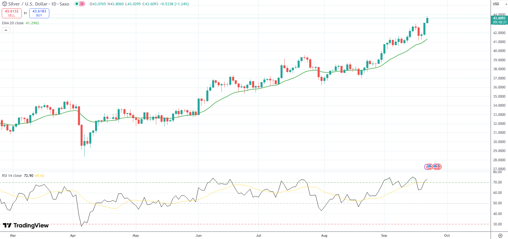 Spot Silver registered a fresh 14-year peak of $43.79/oz. on Monday on expectations the Federal Reserve will continue easing its monetary policy even as the US economy remains resilient.
