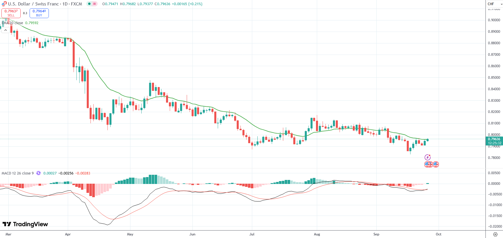 The USD/CHF currency pair was last up 0.21% on the day to trade at 0.7963.