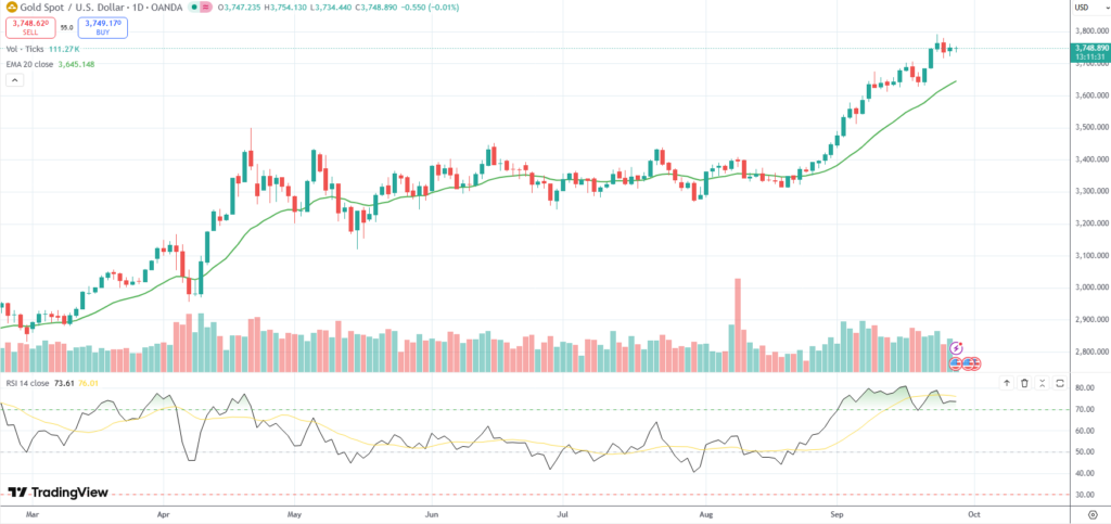 Spot Gold was last down 0.01% on the day to trade at $3,748.89 per troy ounce.