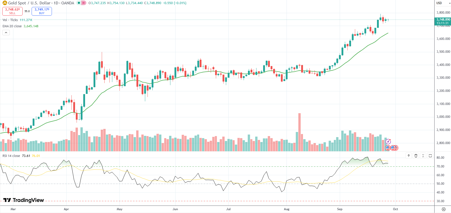 Spot Gold was last down 0.01% on the day to trade at $3,748.89 per troy ounce.