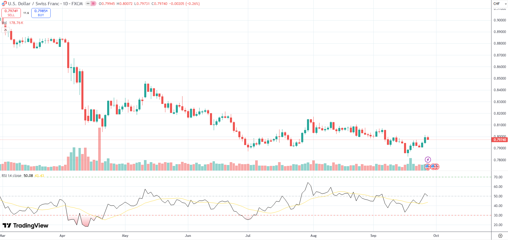 The USD/CHF currency pair settled below recent high of 0.8014, its strongest level since September 5th, in the wake of the Swiss National Bank’s policy decision and after US PCE inflation data met expectations and reinforced bets that the Federal Reserve could ease policy further this year.