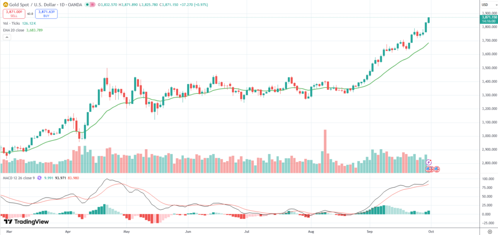Spot Gold was last up 0.97% on the day to trade at $3,871.15 per troy ounce.