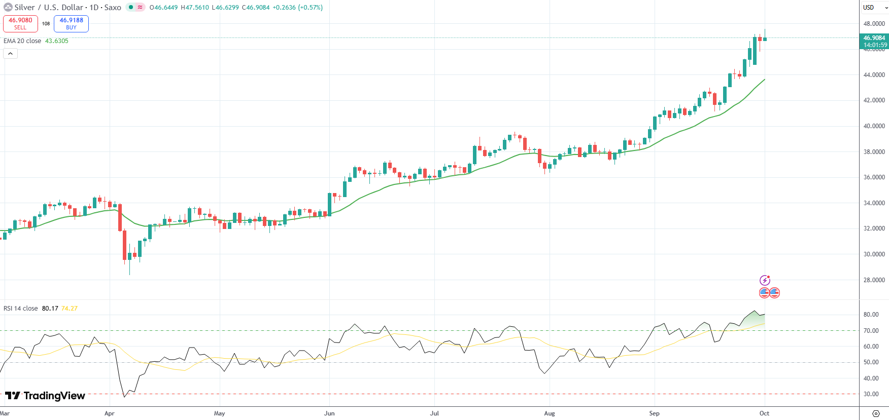 Spot Silver extended gains to a fresh 14-year high of $47.56/oz. on Wednesday, since the US government shutdown fueled demand for safe-haven metals after lawmakers did not secure a temporary funding deal.