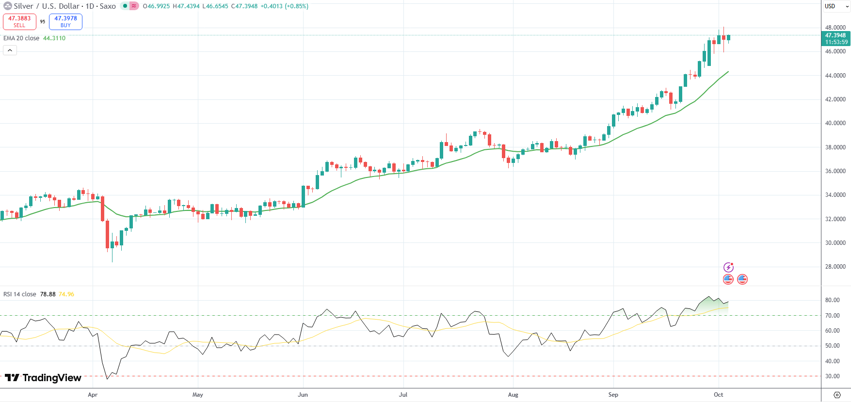 Spot Silver was last up 0.85% on the day to trade at $47.39 per troy ounce.