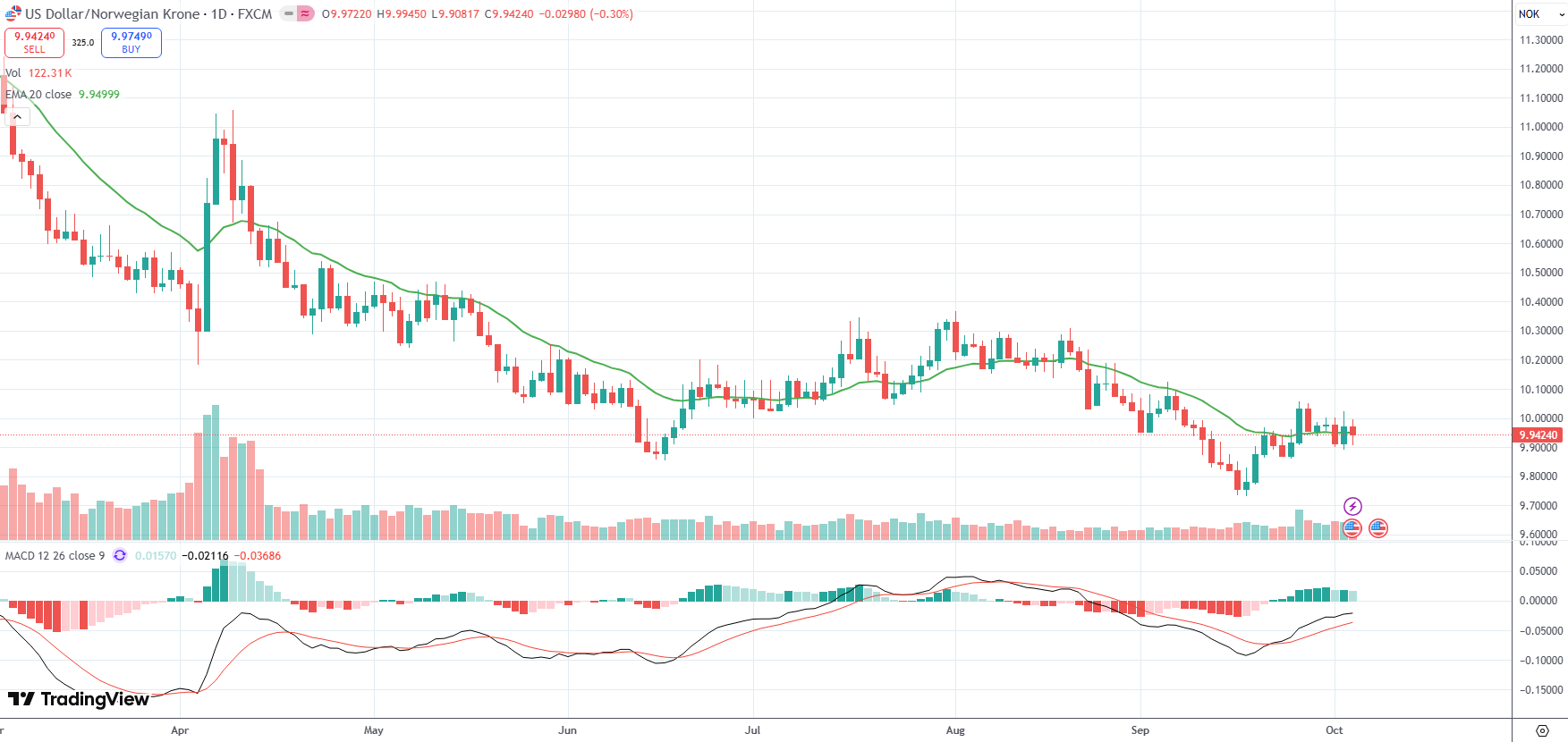 The USD/NOK currency pair settled below recent high of 10.0248, its strongest level since September 26th, after data showed US services sector activity had unexpectedly stalled in September.