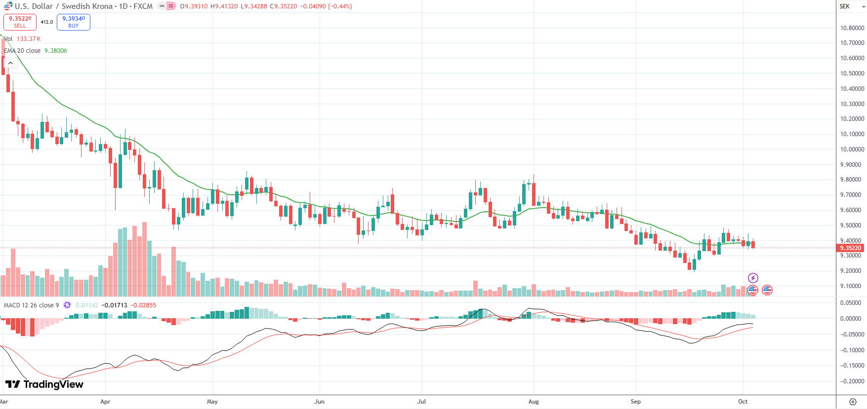 The USD/SEK currency pair settled below recent high of 9.4464, its strongest level since September 26th, after data showed US services sector activity had unexpectedly stalled in September.