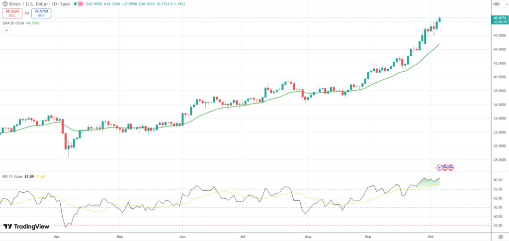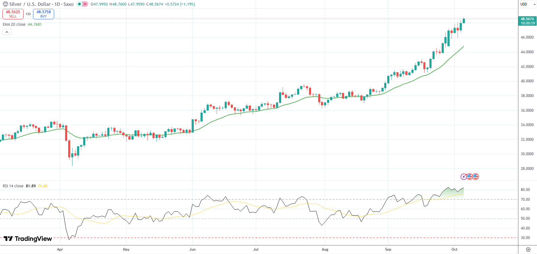 Spot Silver scaled a fresh 14 1/2-year high of $48.76/oz. on Monday, supported by expectations of more Federal Reserve rate cuts, concerns over the impact of the US government shutdown and a drop in the Japanese Yen, which heightened the safe-haven appeal of the metal.