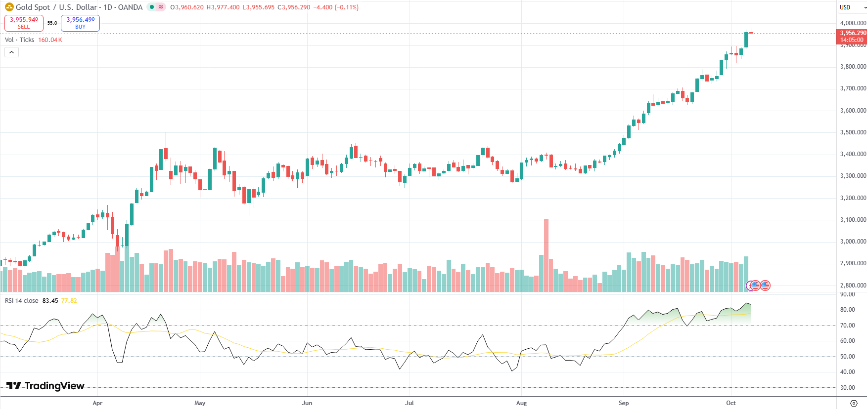 Spot Gold extended gains to a fresh all-time high of $3,977.19/oz. on Tuesday, supported by expectations of more Federal Reserve interest rate cuts and in the absence of any signs of a reprieve from an impasse between the two houses of the US Congress that has caused a government shutdown.