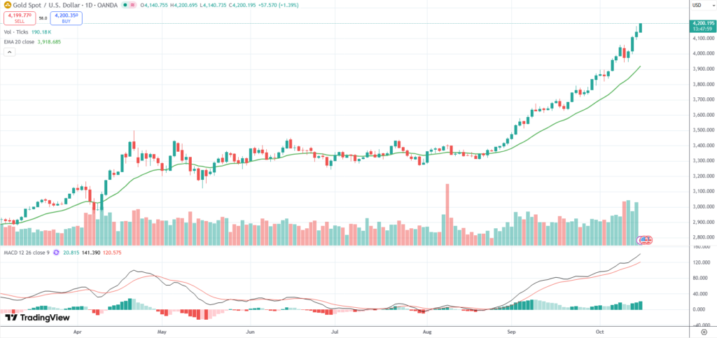 Spot Gold registered a fresh all-time high of $4,200.30/oz. on Wednesday, supported by expectations of more Federal Reserve interest rate cuts this year, the US government shutdown and renewed US-China trade tensions.