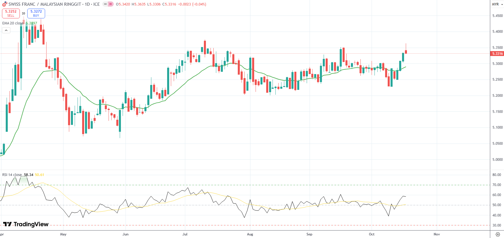 The CHF/MYR currency pair settled below recent high of 5.3635, its strongest level since July 10th, as concerns over US-China trade relations and signs of rising risk in regional American banks triggered a rush into safe-haven currencies such as the Swiss Franc.