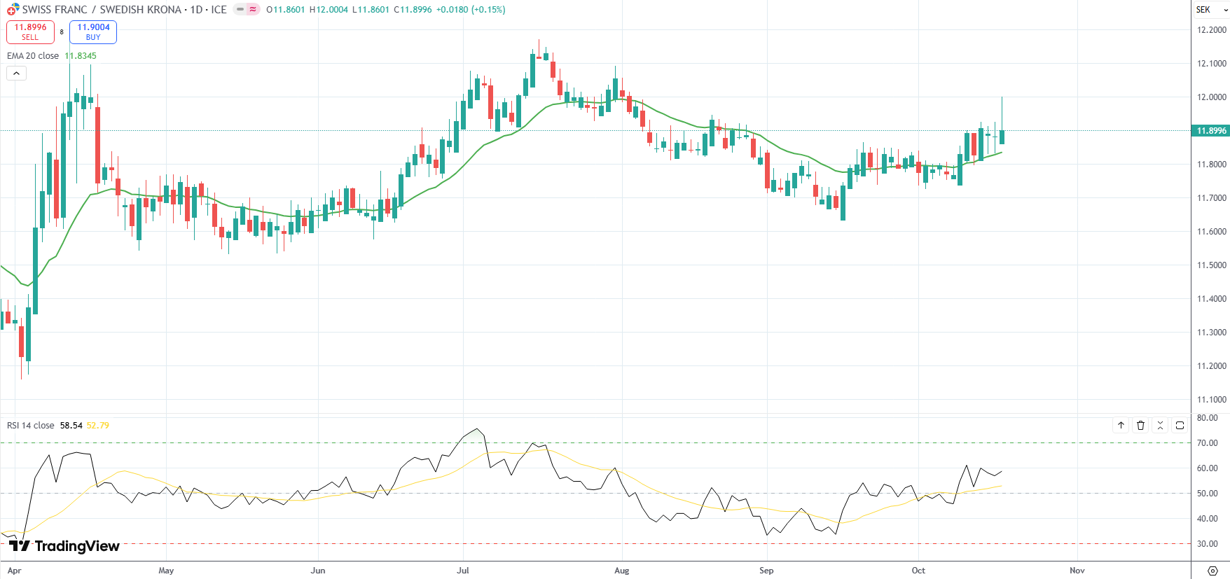 The CHF/SEK currency pair settled below recent high of 12.0004, its strongest level since August 4th, as concerns over US-China trade relations and signs of rising risk in regional American banks triggered a rush into safe-haven currencies such as the Swiss Franc.