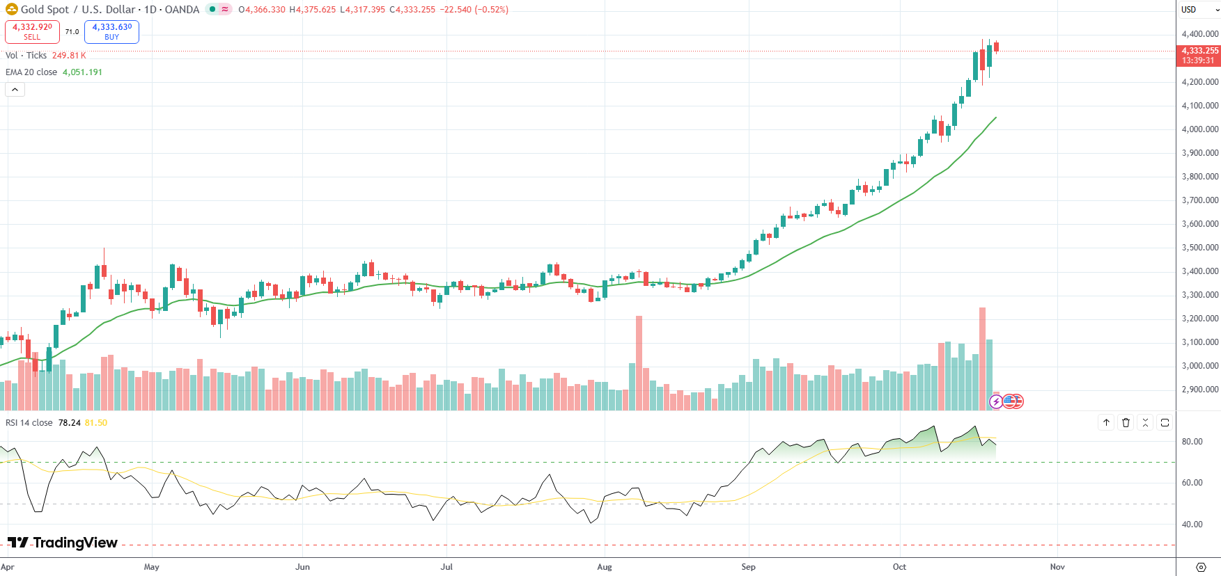 Spot Gold was down 0.52% on the day to trade at $4,333.25 per troy ounce.
