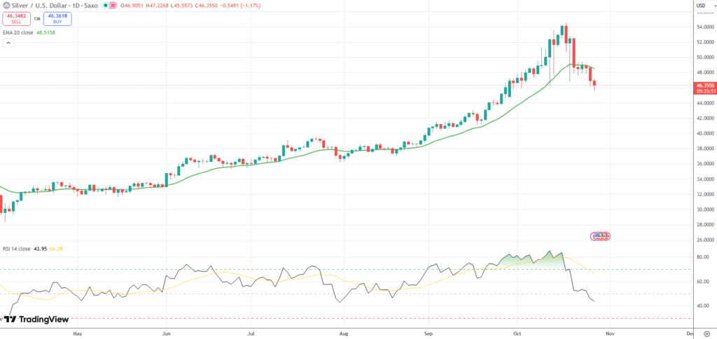 Spot Silver was last down 1.17% on the day to trade at $46.35 per troy ounce.