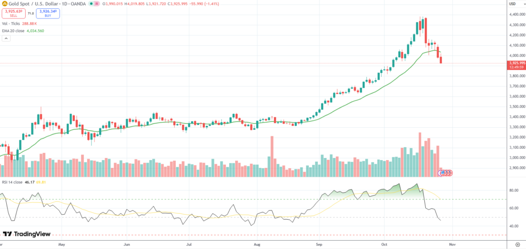 Spot Gold plunged to a three-week low of $3,921.72/oz. on Tuesday, since optimism over a potential US-China trade agreement seemed to have reduced the safe-haven allure of the precious metal.