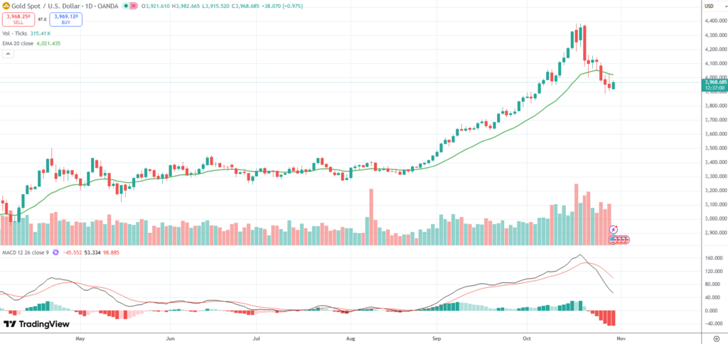 “The hawkish cut from the Federal Reserve and the drop in the odds for another rate cut in December are also negative for gold. I think gold could keep pulling back given this dynamic. Although, in the long run the trend is to the upside for gold.”