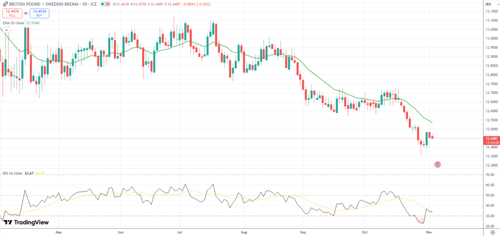 The GBP/SEK currency pair was last little changed on the day to trade at 12.4487.