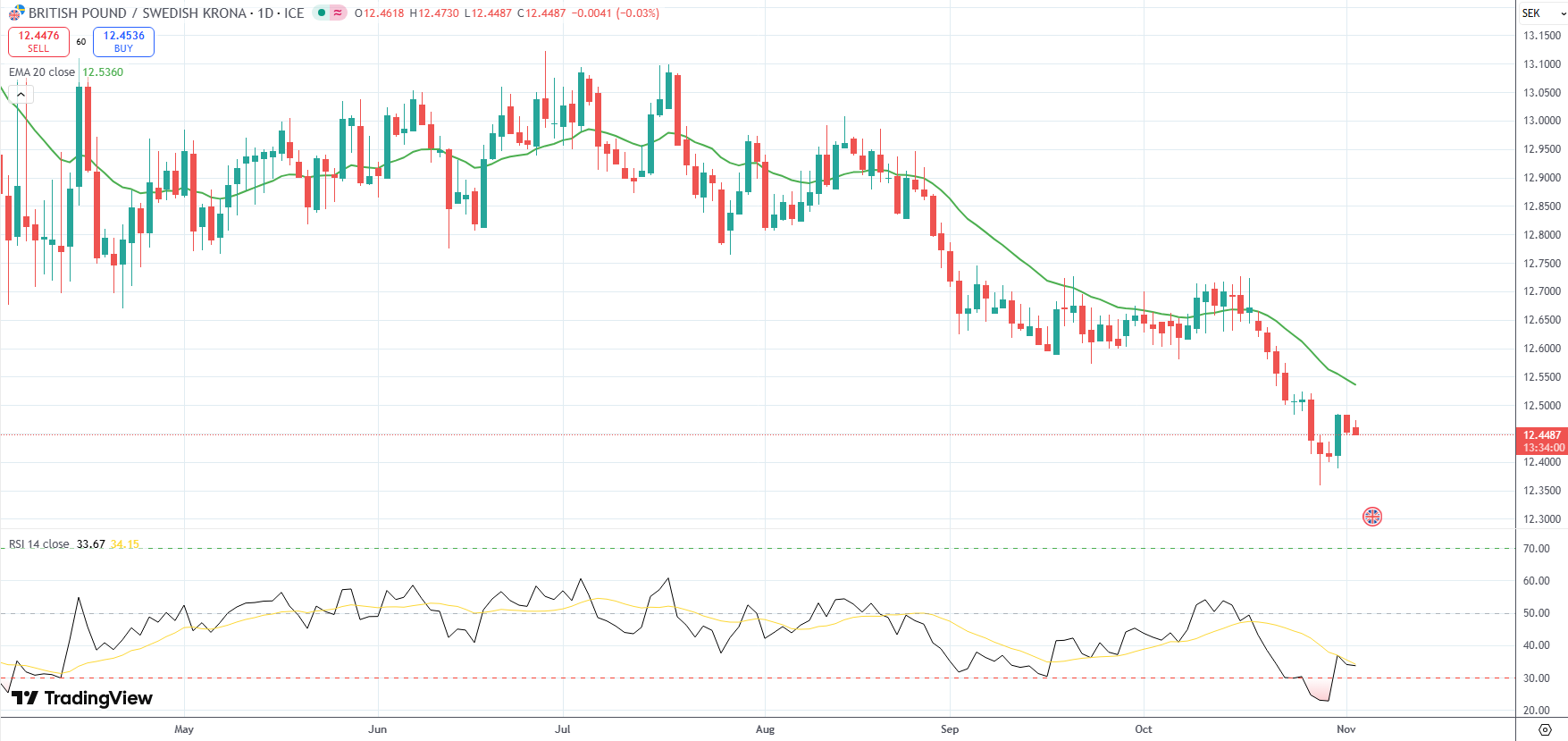The GBP/SEK currency pair was last little changed on the day to trade at 12.4487.