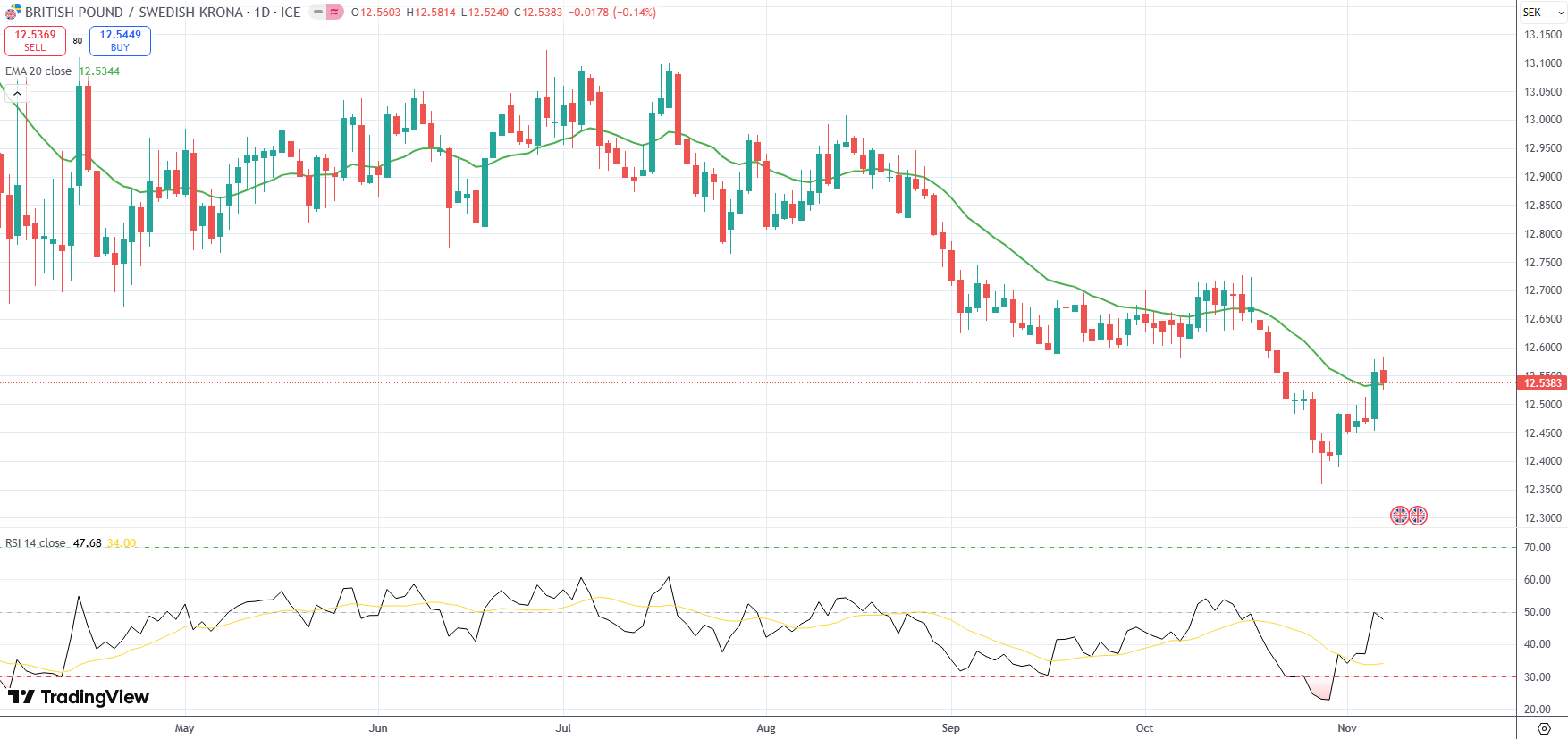 The GBP/SEK currency pair settled below Friday’s high of 12.5814, its strongest level since October 22nd, in the wake of the Bank of England’s and Sweden’s Riksbank policy decisions.