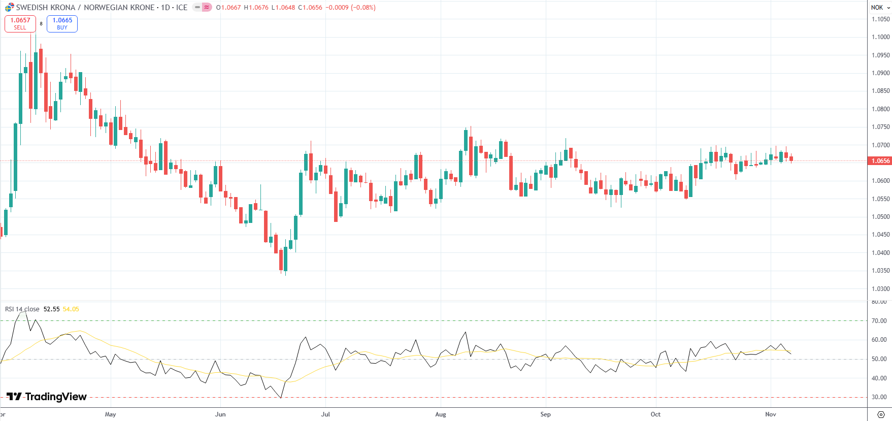 The SEK/NOK currency pair settled below recent high of 1.0697, its strongest level since October 17th, in the wake of Norges Bank’s and Sweden’s Riksbank policy decisions.