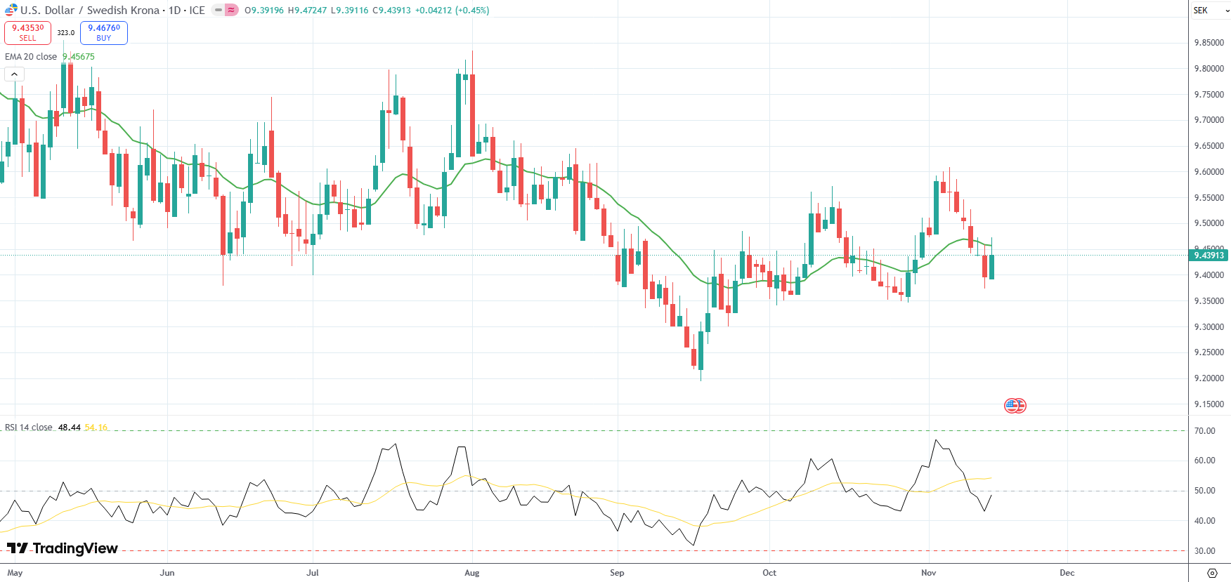 The USD/SEK currency pair settled above recent low of 9.3735, its weakest level since October 29th, as traders now saw a Federal Reserve rate cut in December as much less likely than before.