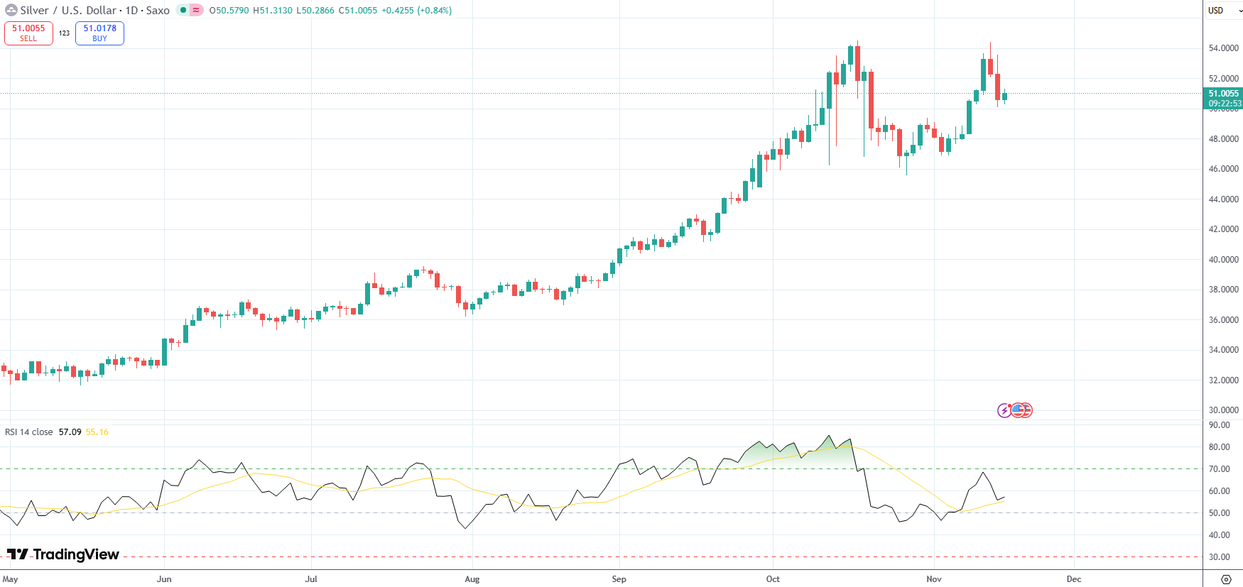 Spot Silver was last up 0.84% on the day to trade at $51.00 per troy ounce.