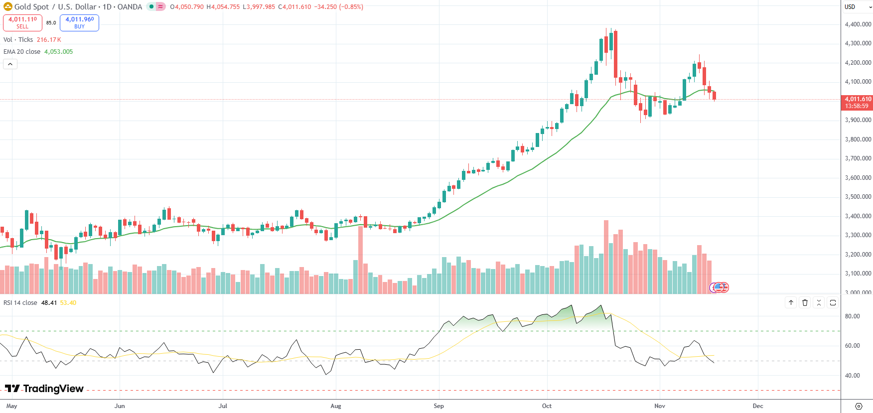 Spot Gold was last down 0.85% on the day to trade at $4,011.61 per troy ounce.