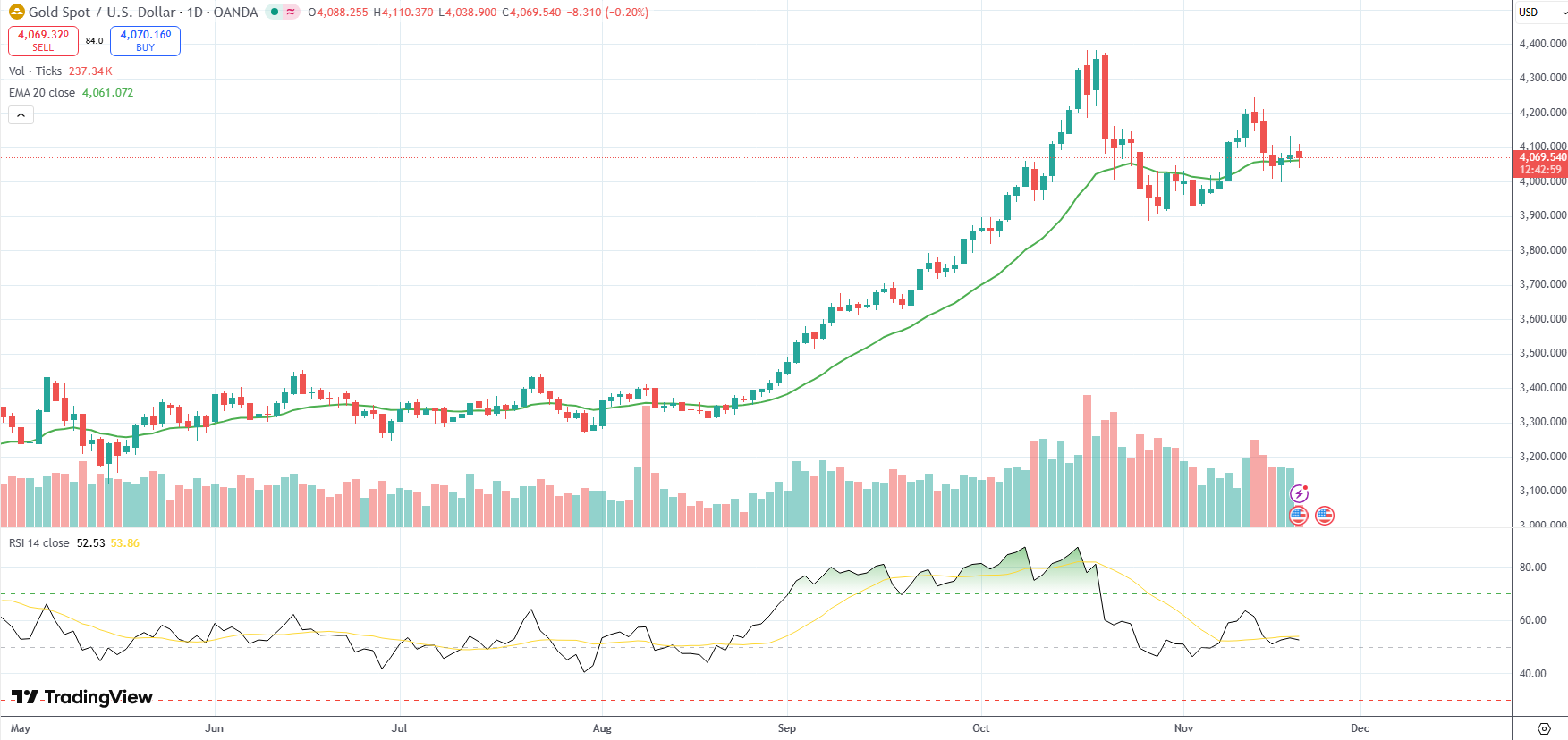 Spot Gold was last down 0.20% on the day to trade at $4,069.54 per troy ounce.