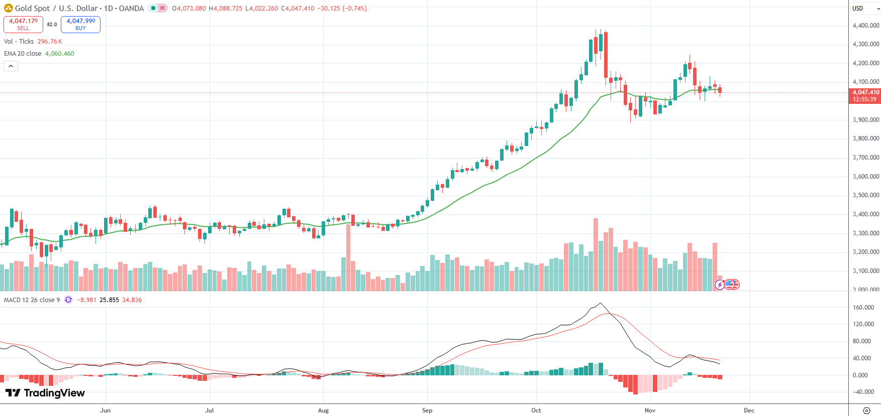 Spot Gold was last down 0.74% on the day to trade at $4,047.41 per troy ounce.