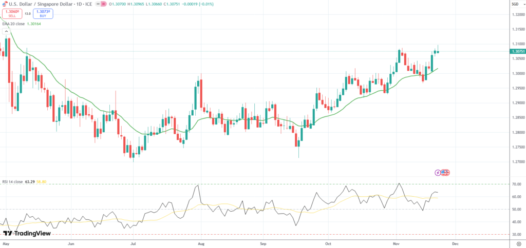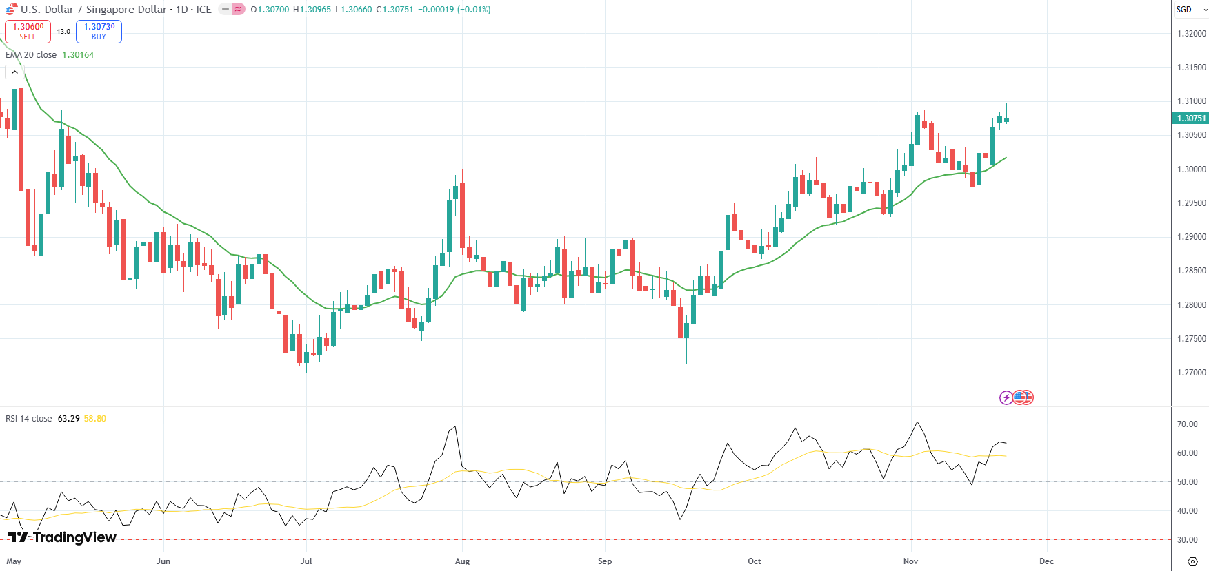 The USD/SGD currency pair settled below Friday’s high of 1.3096, its strongest level since May 2nd, after stronger-than-expected US employment data added to expectations that the Federal Reserve would abstain from lowering borrowing costs in December.