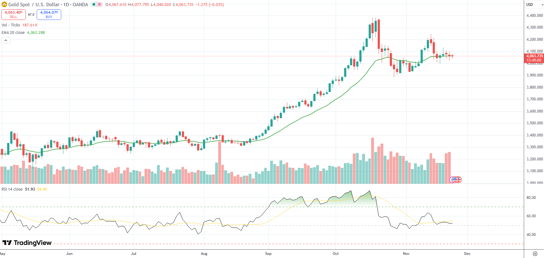 Spot Gold was last little changed on the day to trade at $4,063.73 per troy ounce.
