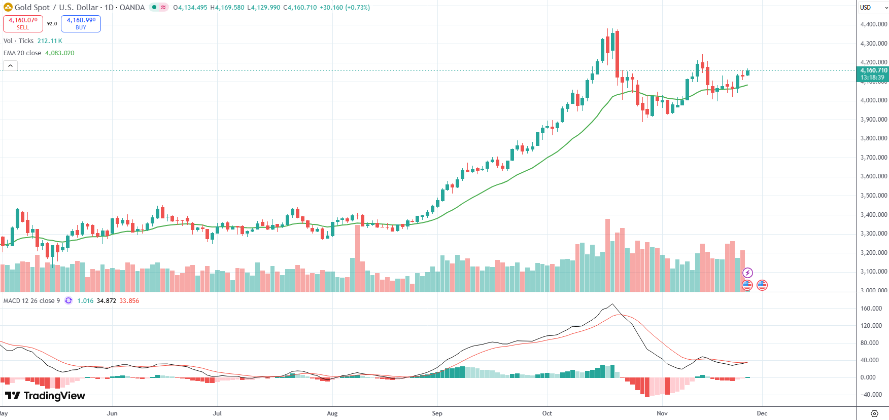 Spot Gold was last up 0.73% on the day to trade at $4,160.71 per troy ounce.